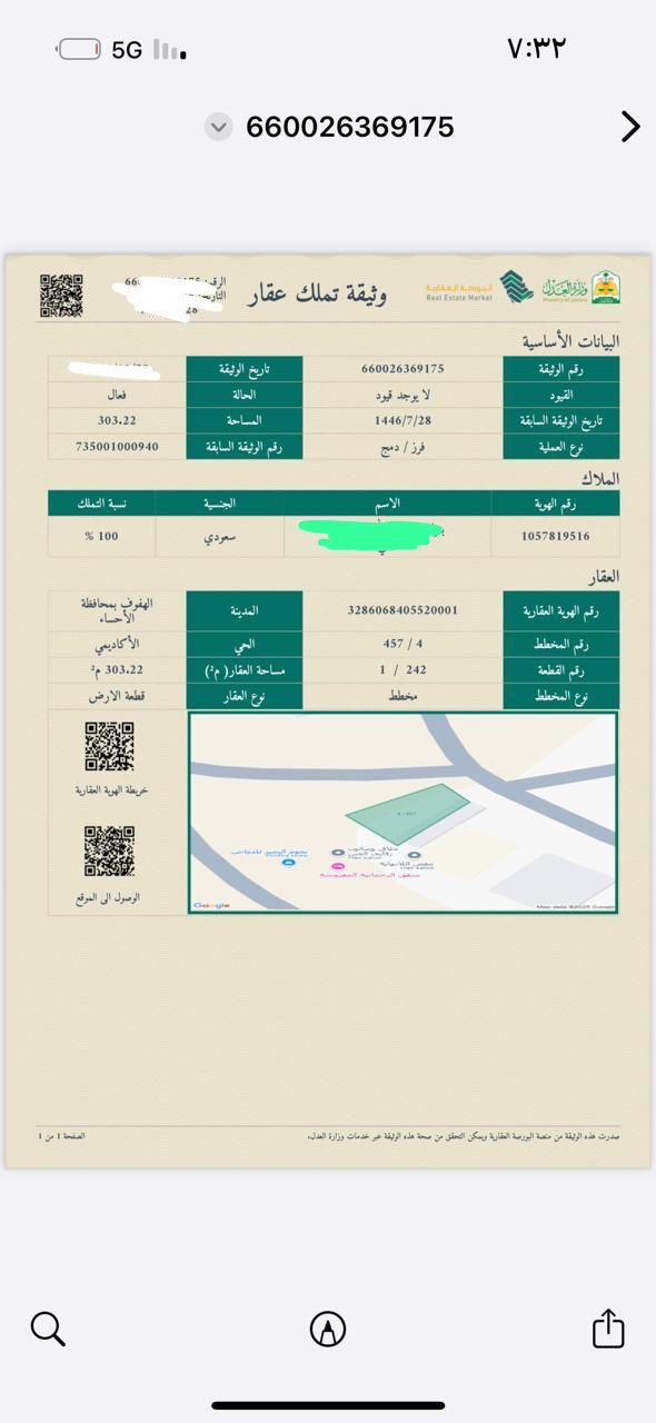 أرض سكنية صك جاهز للبيع المنطقة: الشرقية المحافظة: الأحساء في الرضا رقم المخطط: 457/4 رقم الأرض 242 المساحة 302 شارع 15 واجهة العقار: شرقية حدود وأطوال العقار: 10*31 أرض مفروزة قطعتين مساحة كل قطعة 302م المتر 1,600 ريال المشاهدات 3 تاريخ إنتهاء الإعلان 2025-12-23